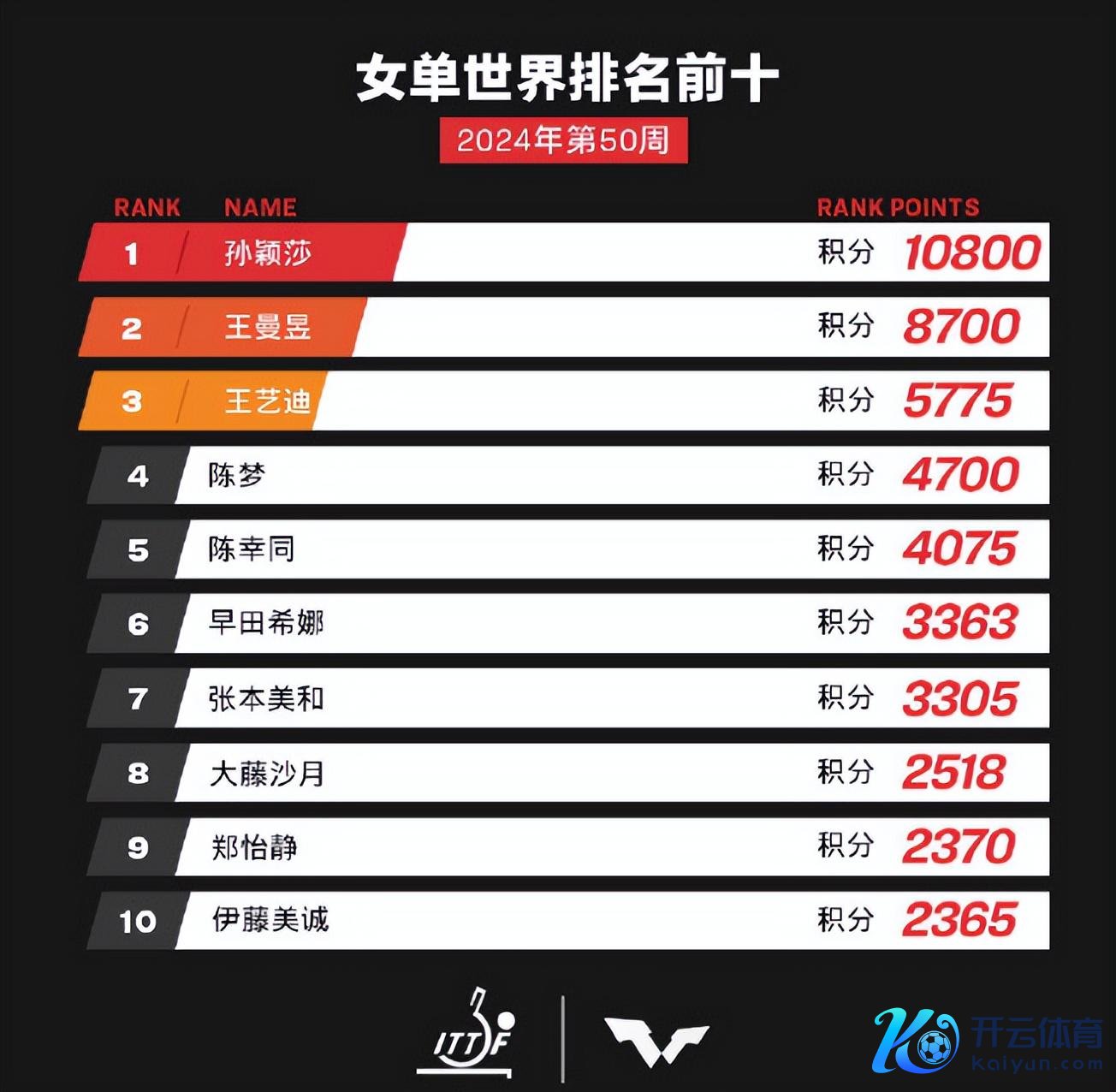 2024年第50周的寰宇名次,孙颖莎10800分断崖第一,8700分第二,王艺迪5775第三,陈梦4700第四,陈幸同4075第五,国乒包揽寰宇前五。