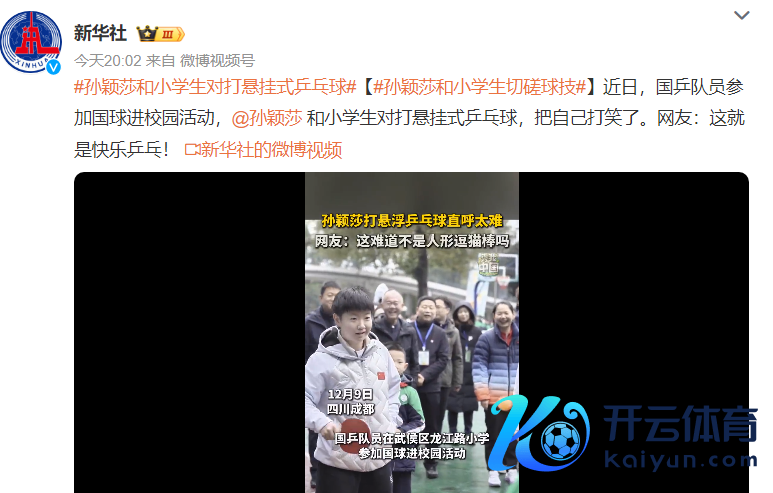 北京本事12月10日,新华社报谈,国乒球员孙颖莎参与国球进校园活动,他在成齐武侯区龙江路小学与小学生比吊挂式乒乓球,莎莎把我方的逗笑了。