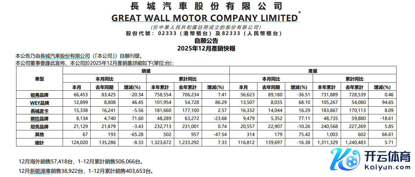 长城汽车:2025年汽车销量为132.4万辆,同比增长7.33%长城汽车:2025年汽车销量为132.4万辆,同比增长7.33%