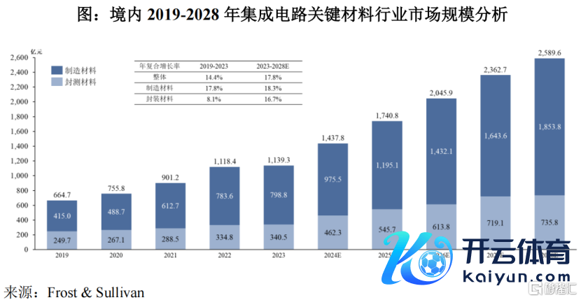 凭证弗若斯特沙利文统计及预测,境内集成电路要津材料阛阓界限总体从2019年664.7亿元增长到2023年1139.3亿元,年复合增长率为14.4%,预测2028年阛阓界限为2589.6亿元。