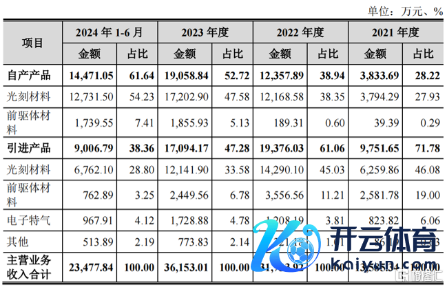 2021年至2024年1-6月,公司自产居品占主贸易务收入的比例由28.22%进步至61.64%,引进居品的占比由71.78%下跌至38.36%。