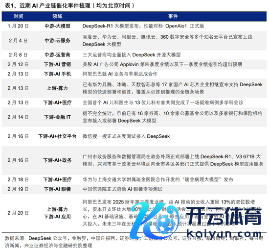 DeepSeek发布后,各大云劳动商、运营商、金融公司、大厂、政务平台等主体加快接入,抓续考据DeepSeek助力AI平权后,将极大裁减AI诳骗落地的门槛,推动各行业AI渗入率的晋升、更多垂直诳骗加快落地;