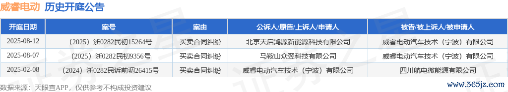案号:(2025)浙0282民初15264号审理法院:慈溪市东谈主民法院案由:交易协议纠纷当事东谈主信息: 原告/上诉东谈主:北京天启鸿源新动力科技有限公司 被告/被上诉东谈主:威睿电动汽车工夫(宁波)有限公司开庭日历:2025年8月12日凭证统计,近一年内以威睿电动汽车工夫(宁波)有限公司为当事东谈主的历史开庭公告有3则,其中案由为“交易协议纠纷”的公告以3则居首。历史开庭公告如下: