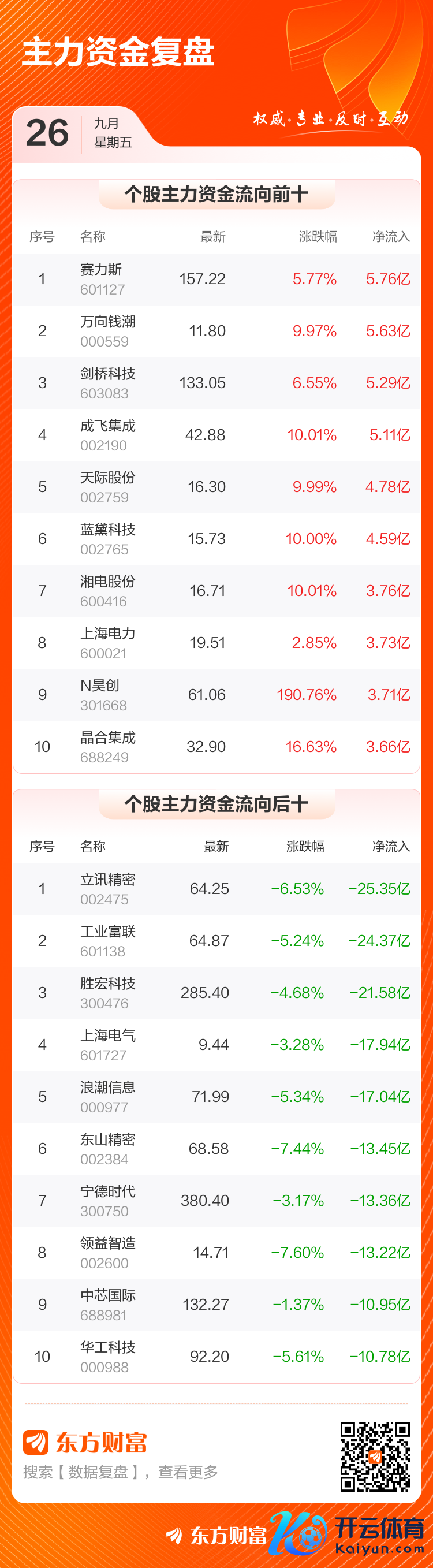 主力净卖出个股中,立讯精密名交替一,主力净卖出25.35亿元;工业富联名交替二,主力净卖出24.37亿元。