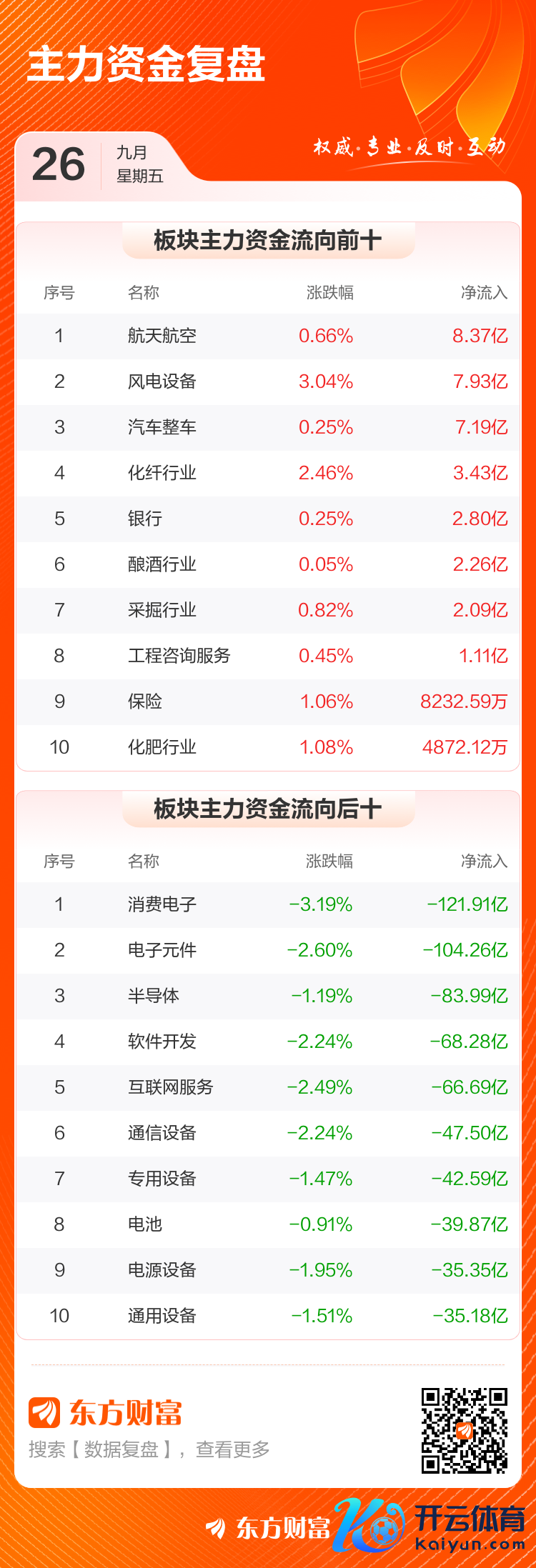 9月26日,沪指跌0.65%,深成指跌1.76%,创业板指跌2.6%。两市成交额2.15万亿,较上个交游日缩量2242亿。数据清楚,本日大盘主力资金净流出946.98亿。航天航空、风电成就、汽车整车等板块主力资金流入名次居前,其中航天航空净流入8.37亿元。